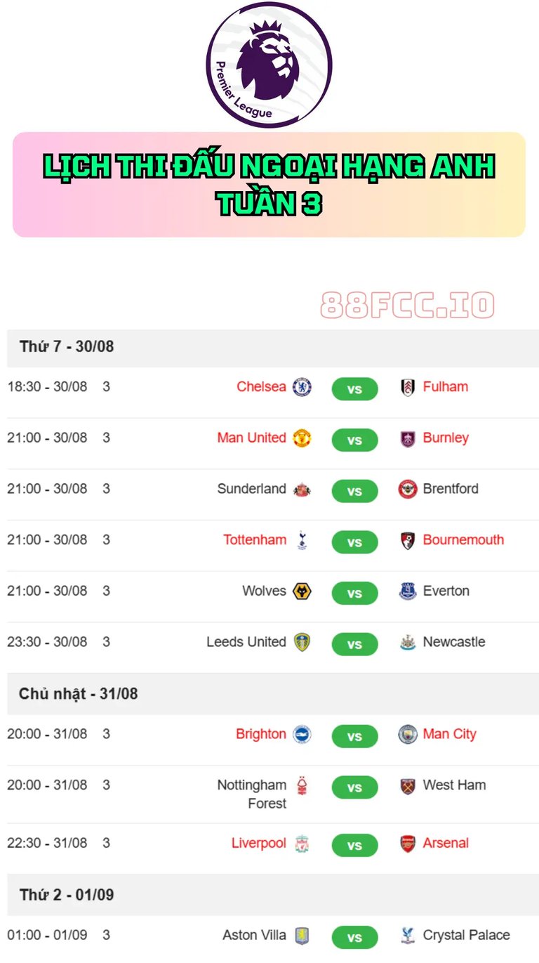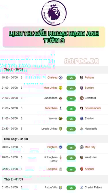 Lịch Thi Đấu Vòng 3 Premier League Ngoại Hạng Anh 2025